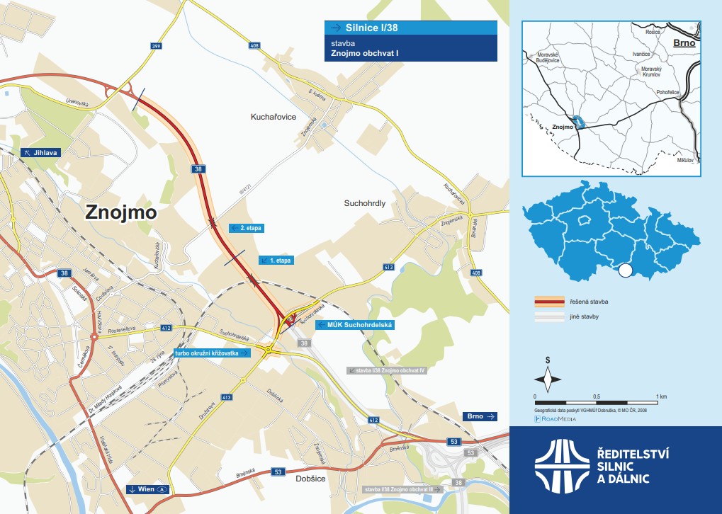 Ředitelství silnic a dálnic podalo žádost o územní rozhodnutí a stav. povolení k dostavbě severního obchvatu Znojma. Finišuje se s podklady pro soutěž na zhotovitele. Jde o zbývajících 750 m mezi I/38 a I/53 (Jihlava/Brno). Stavbu Znojmo obchvat I. chtějí zahájit příští rok.
