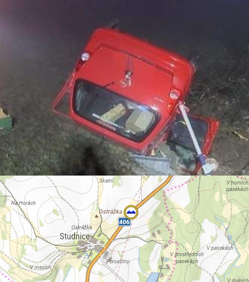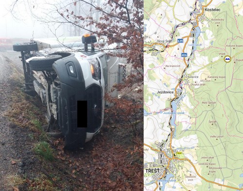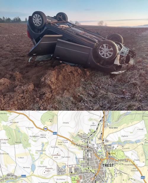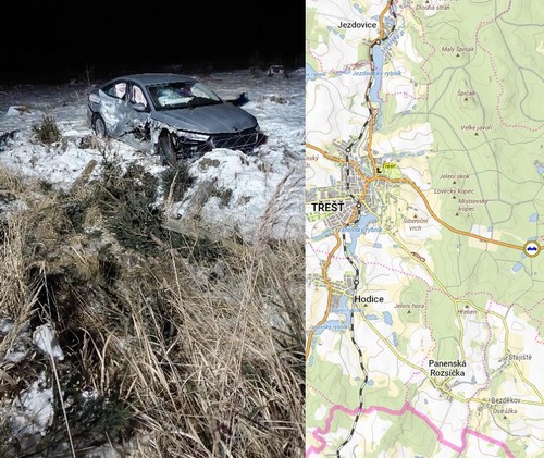 Mezi Třeští a Batelovem havarovala dnes, v pátek 12. listopadu 2025 v 7:00 hodin ráno, řidička a skončila na střeše mimo komunikaci.