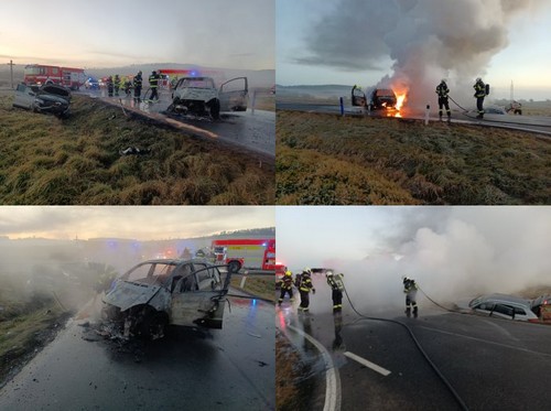 Hořící auto hasiči uhasili řádově v minutách. Poté asistovali při naložení obou vraků na vozy odtahových služeb.