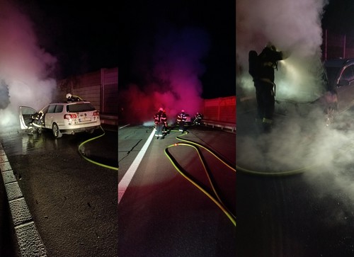 Požáru osobního automobilu v motorové části. Komunikace je průjezdná jedním pruhem.