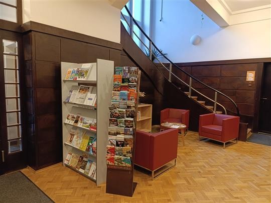 Ve vstupní hale je nový nábytek, pohodlná křesla lákají k odpočinku, který mohou zpestřit knihy a časopisy uložené v knihovničce. Zákoutí se sedacím nábytkem a konferenčním stolkem odděluje od vstupních dveří velký regál na letáky, kde mohou turisté najít mnoho zajímavých informací o novém Bydžově a blízkém i vzdálenějším okolí. Dále je pro návštěvníky k dispozici notebook, kde je možné navštívit online katalog knih, které jsou v městské knihovně, popřípadě vyhledat další informace. Celý prostor poměrně velké haly se vhodně rozdělil na zóny a zútulnil.